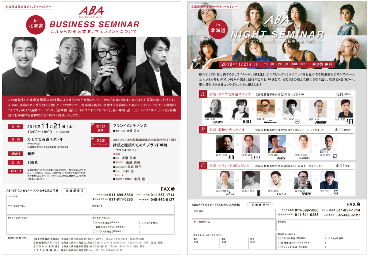 心よりお見舞い申し上げます。一般社団法人アジアビューティアカデミー(ABA)は、美容の力で被災地を支援したいとの思いから、北海道を拠点に活躍する美容師のためのチャリティーセミナーを開催。